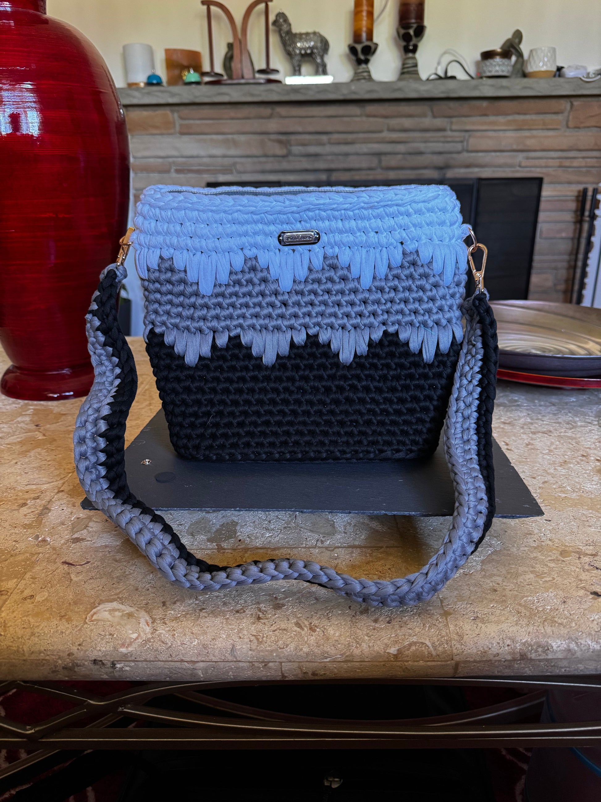 Black, grey and. white crocheted shoulder bag with a leather bottom and fabric lining