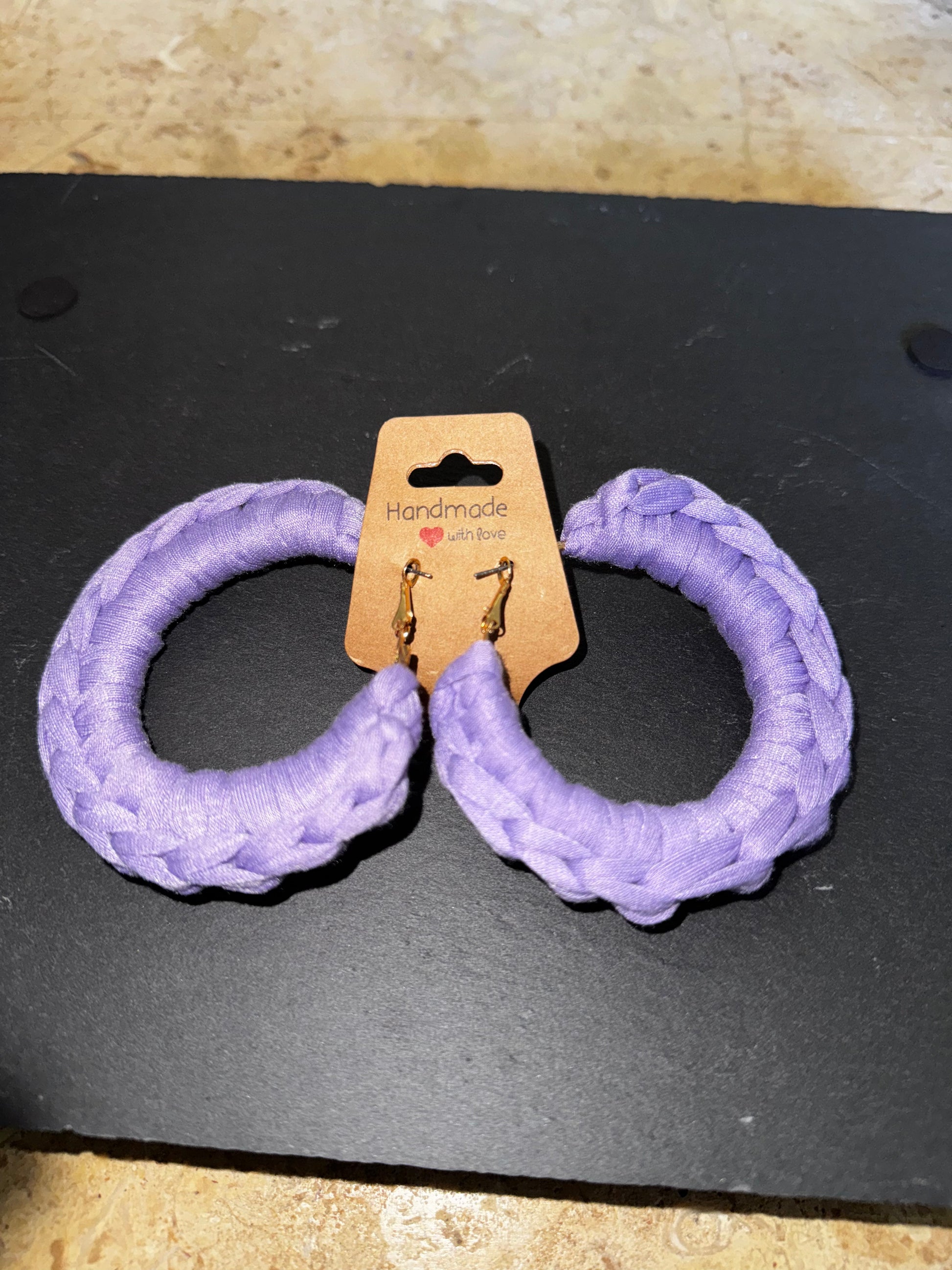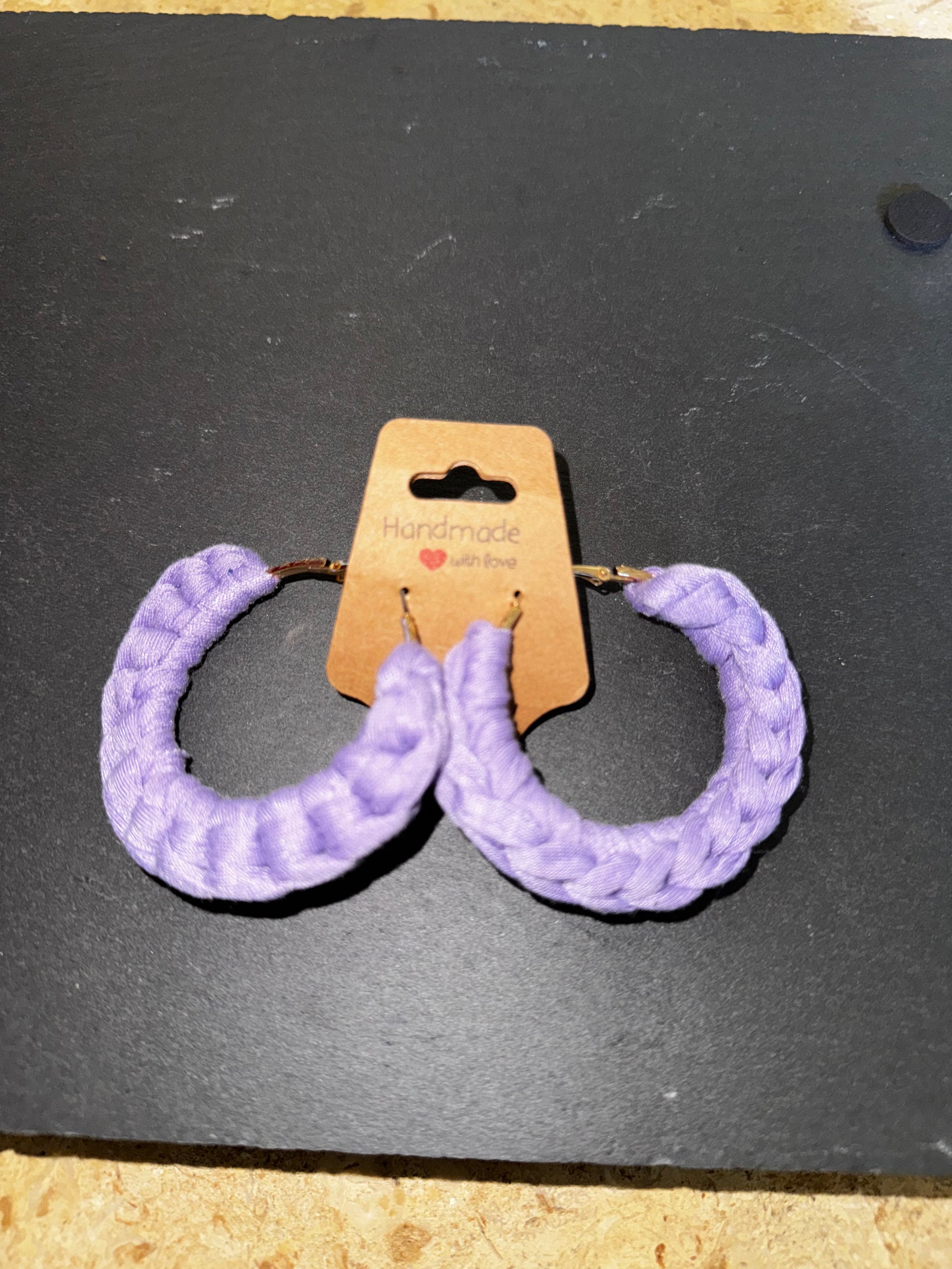 Crocheted earrings over silver hoops