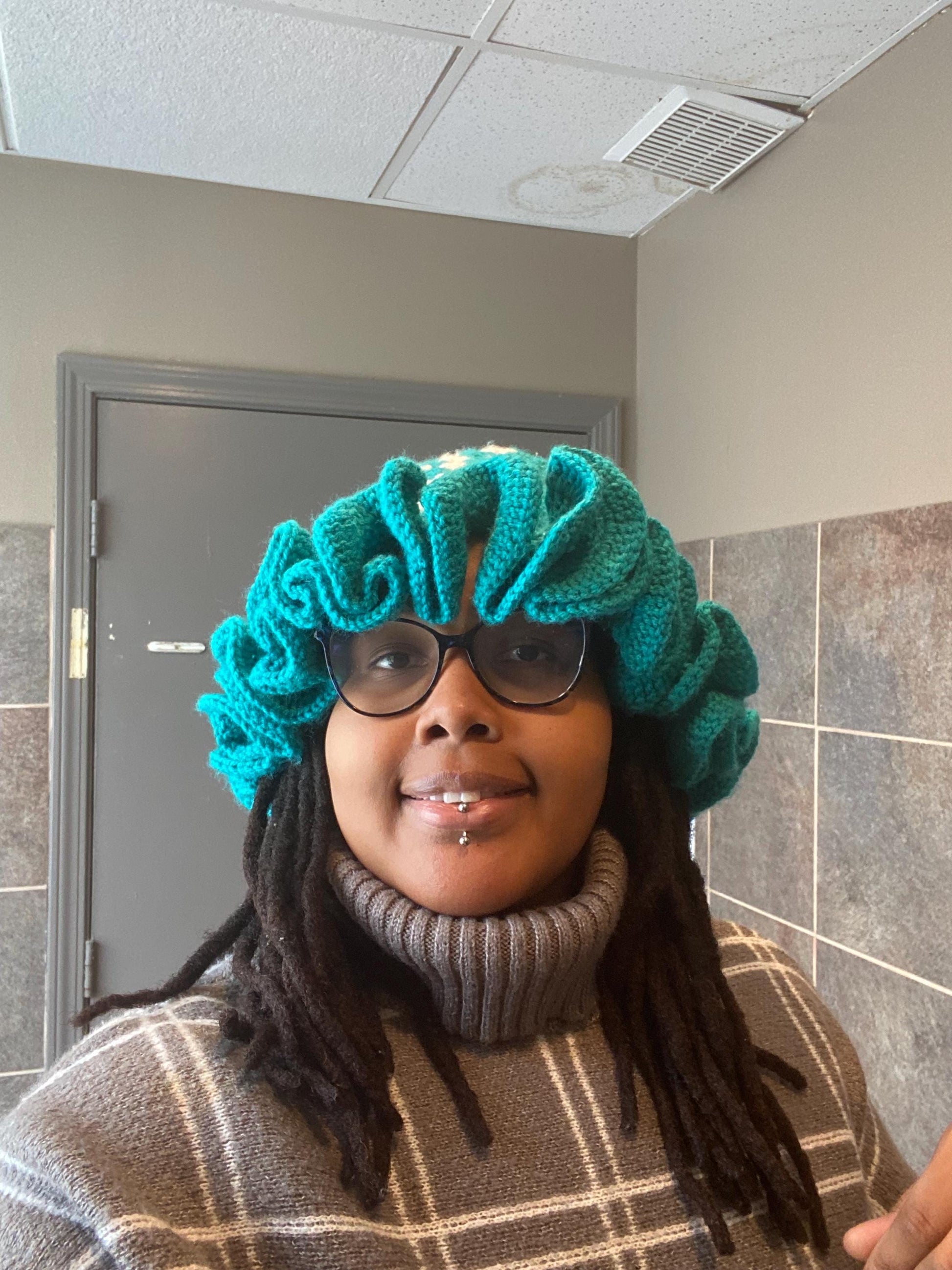 Crocheted Granny square hat with ruffled rim