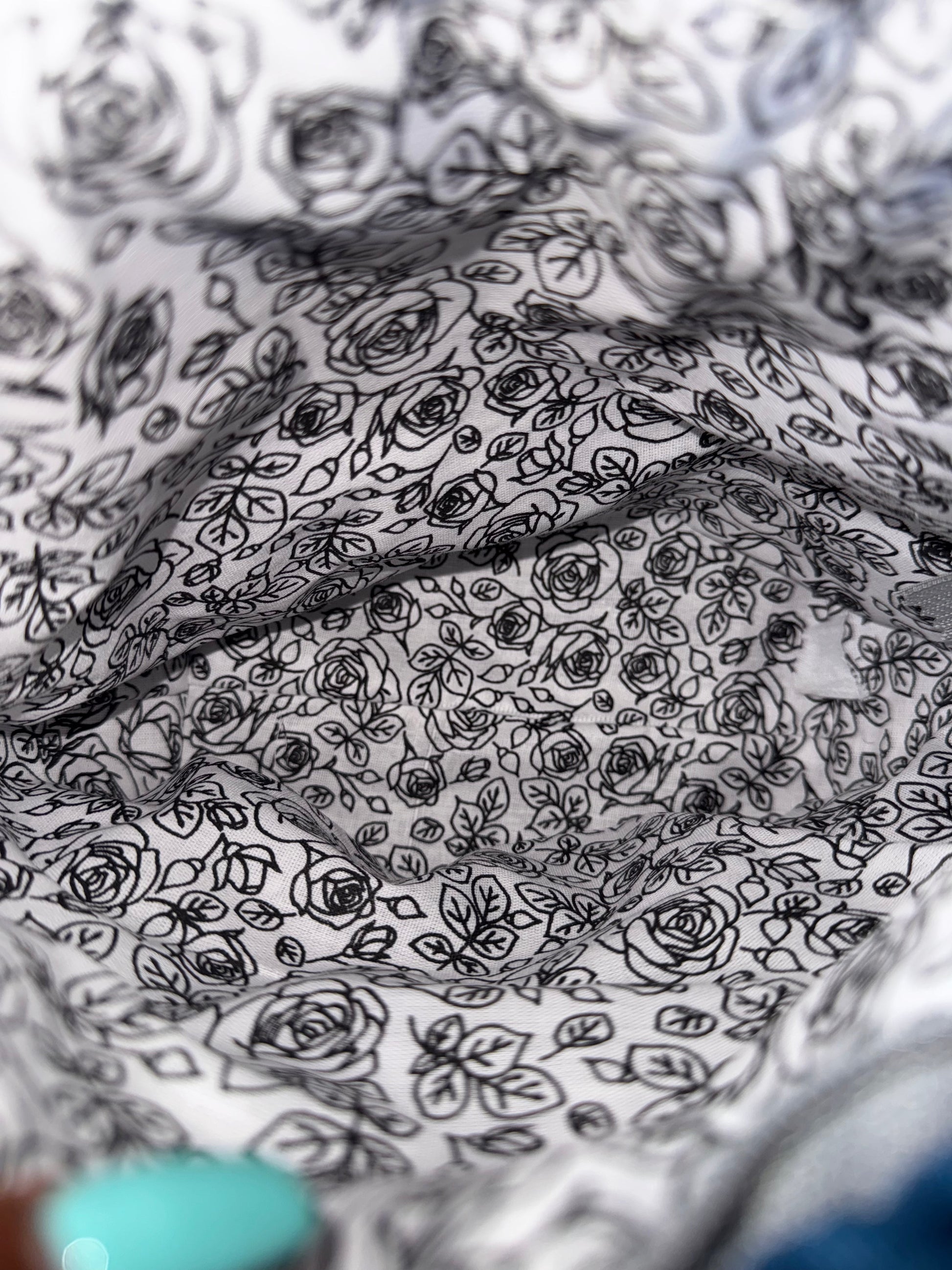 Crocheted blue and grey purse with a crossbody strap. This is purse has a leather bottom, zipper closure, and a fabric lining