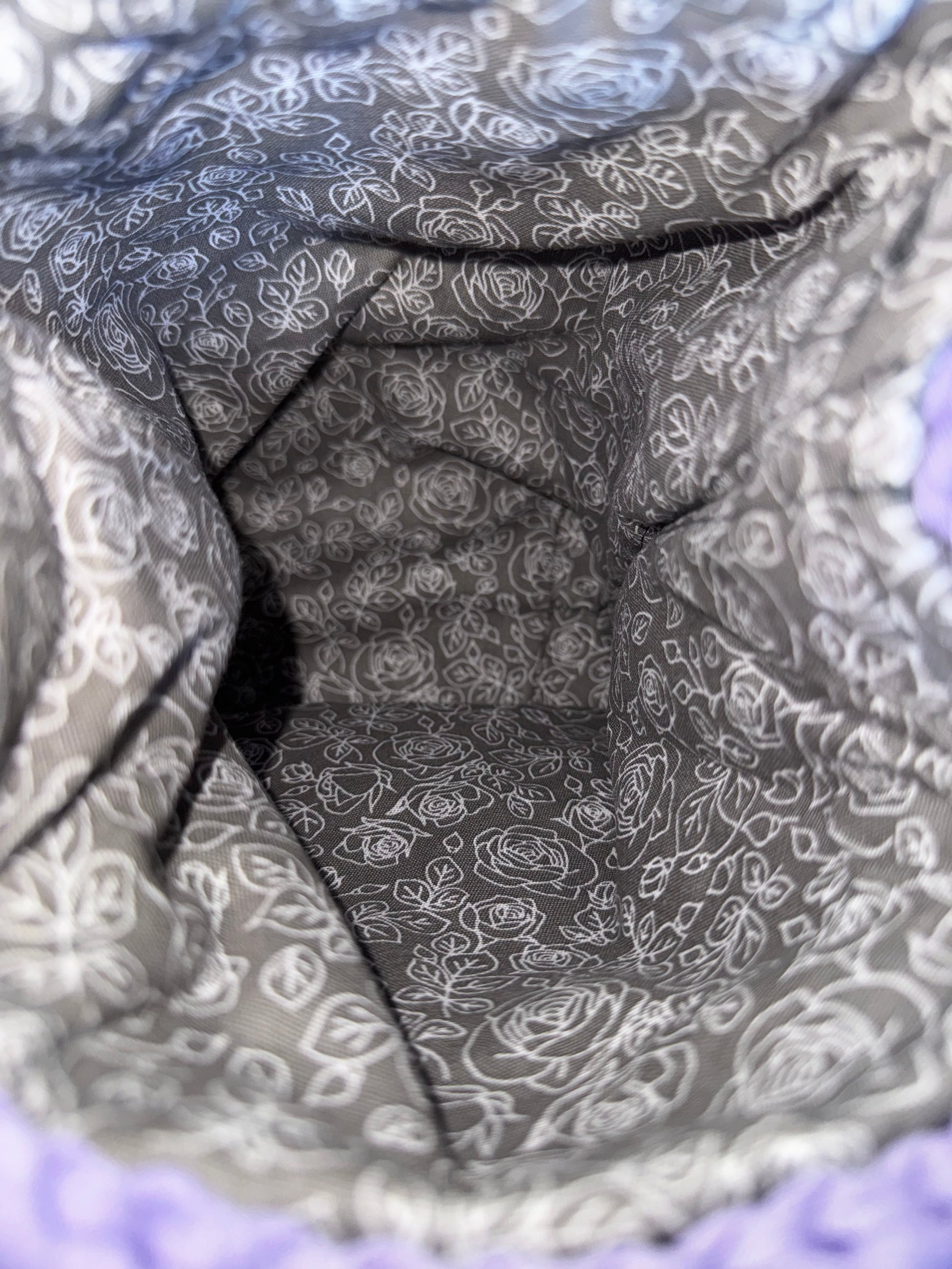 This purse is two tones of purple. It has a drawstring closure, shoulder carrying strap, leather bottom, and a fabric lining. it also comes with a purple tassel.