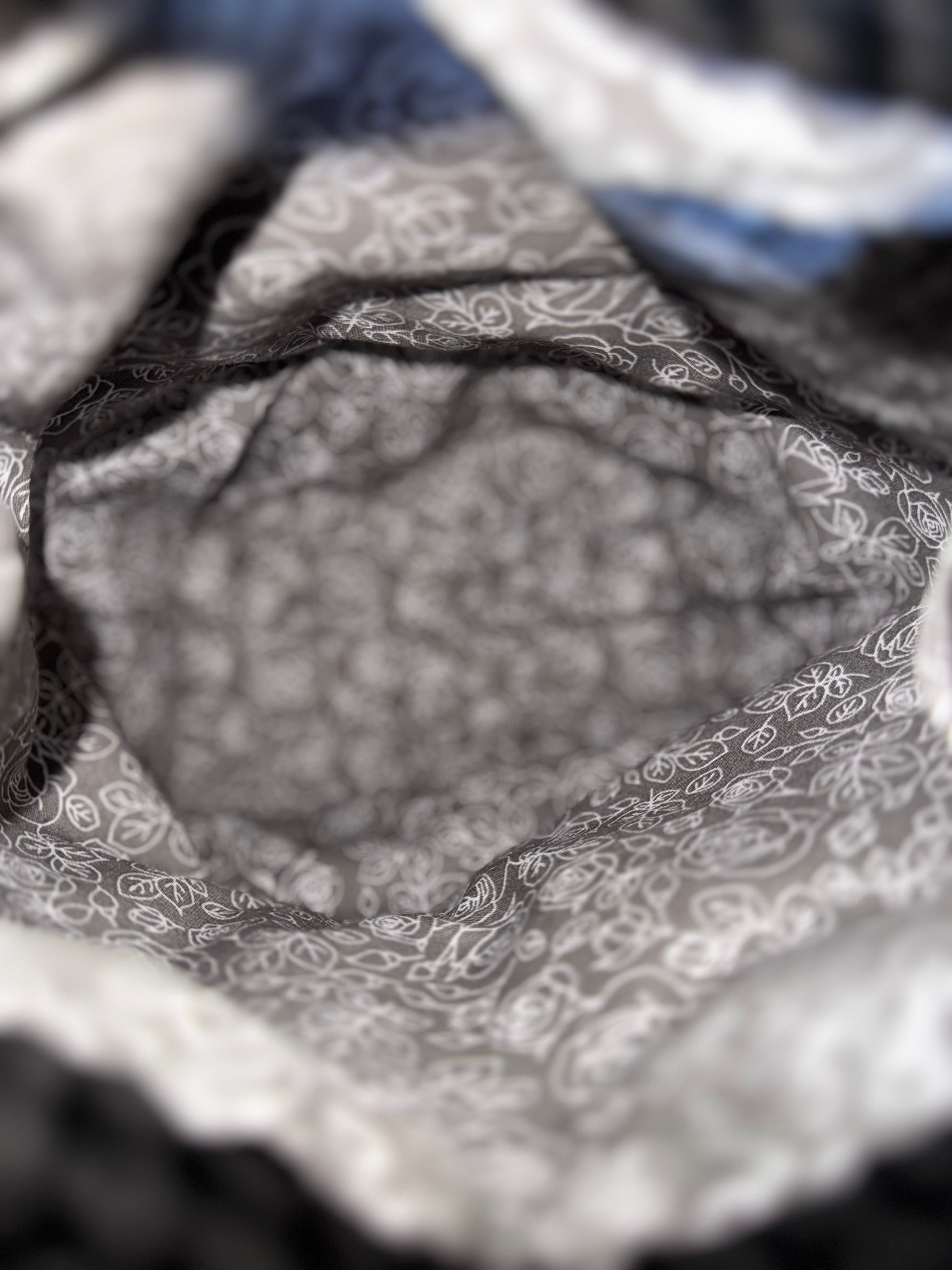Crocheted Black and white crossbody. this purse has a leather bottom, drawstring closure, and fabric lining