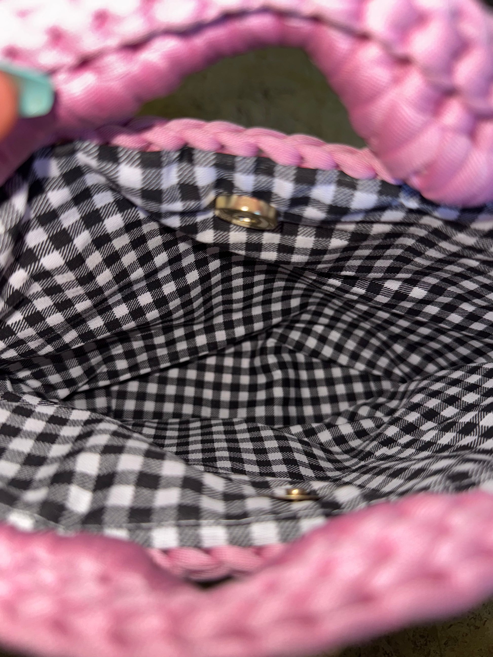 Crocheted pink handbag with a handle. This purse has a pink leather bottom, magnet closure, and a fabric lining