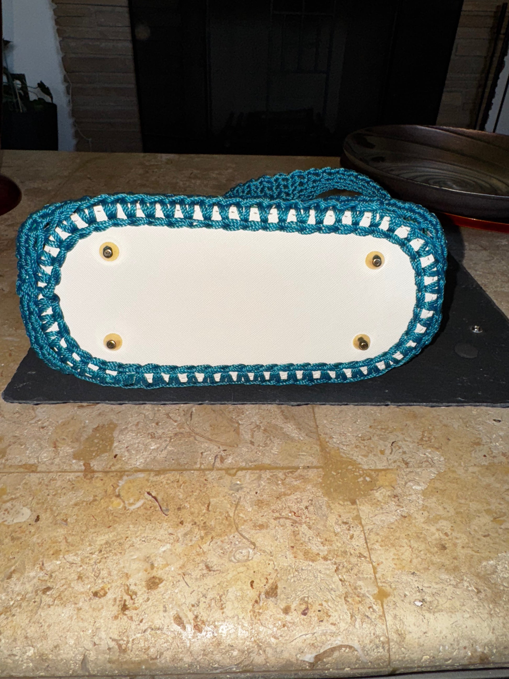 Crocheted handbag with a short handbag handle. This bag has a leather bottom, magnetic flap closure, and a fabric lining.