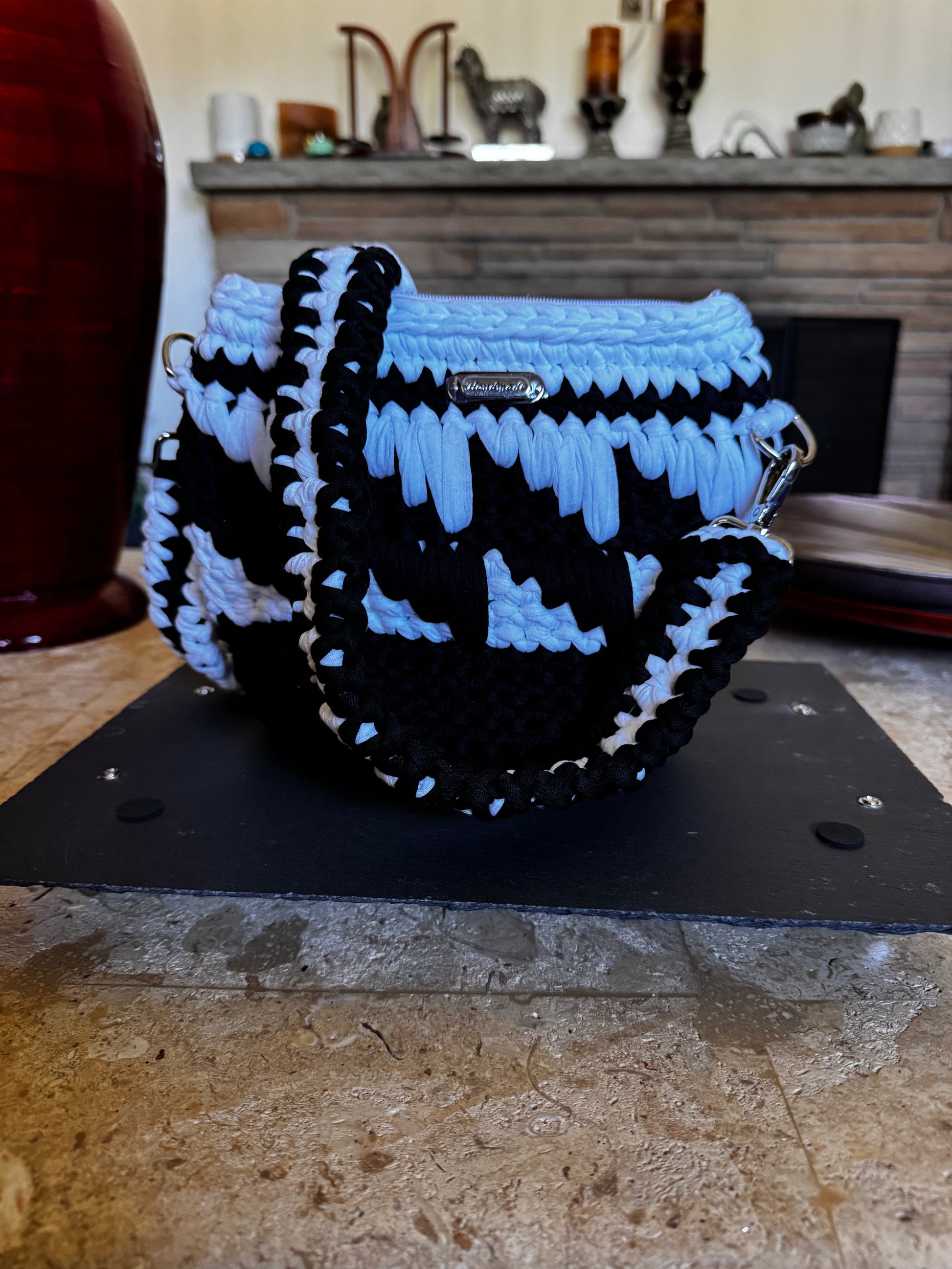 This is a small black and white crocheted crossbody. it has a leather bottom, zipper closure and a fabric lining.