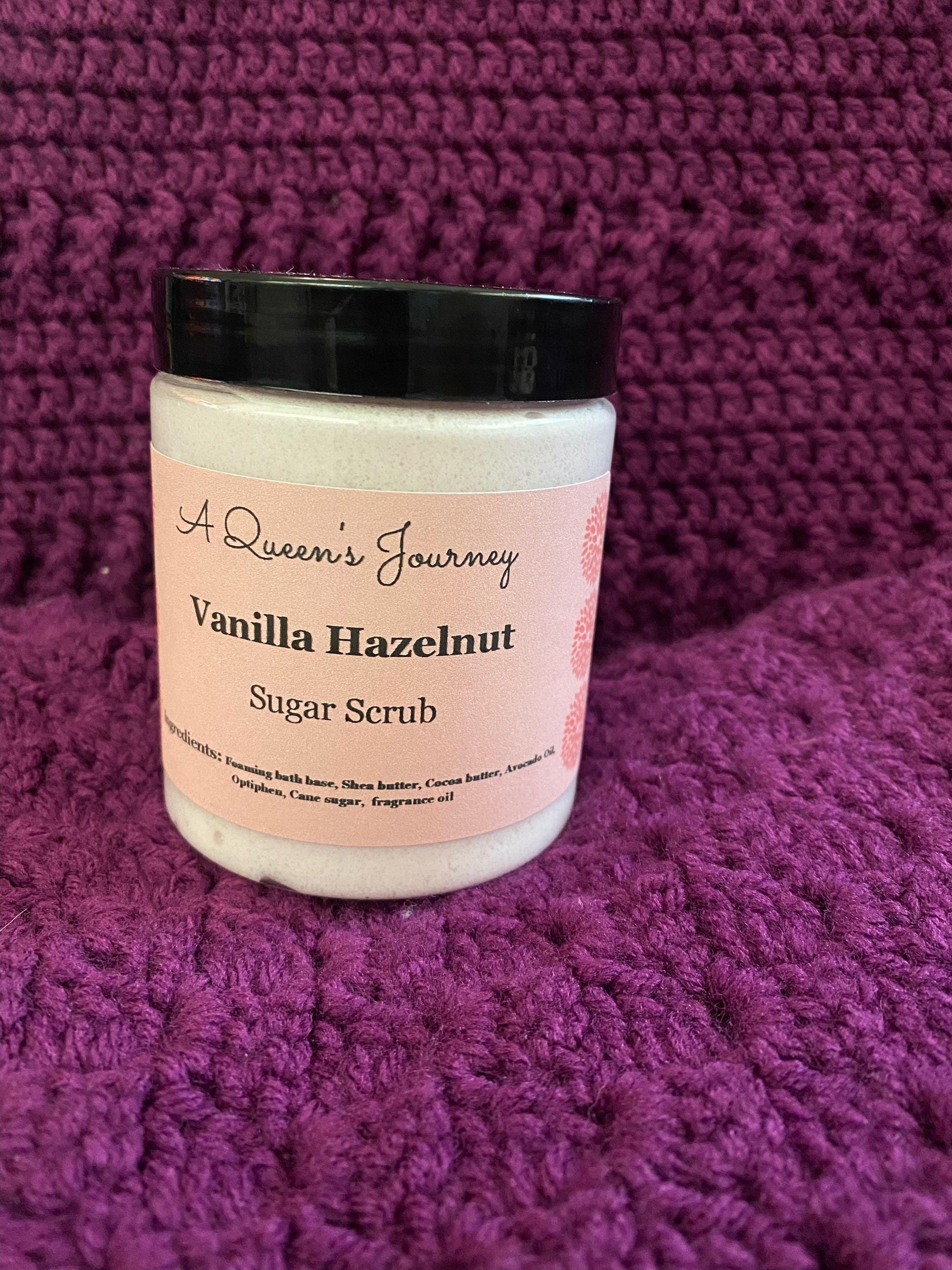 This is a homemade vanilla hazelnut scented sugar scrub that also lathers and gently exfoliates and cleanses the skin.